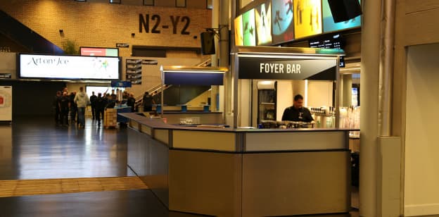 Unser zentraler Treffpunkt vor und nach dem Anlass mitten im Foyer! Hier findest Du wenige Schritte von den beiden Haupteingängen ein Standard-Barangebot sowie kleine Snacks.